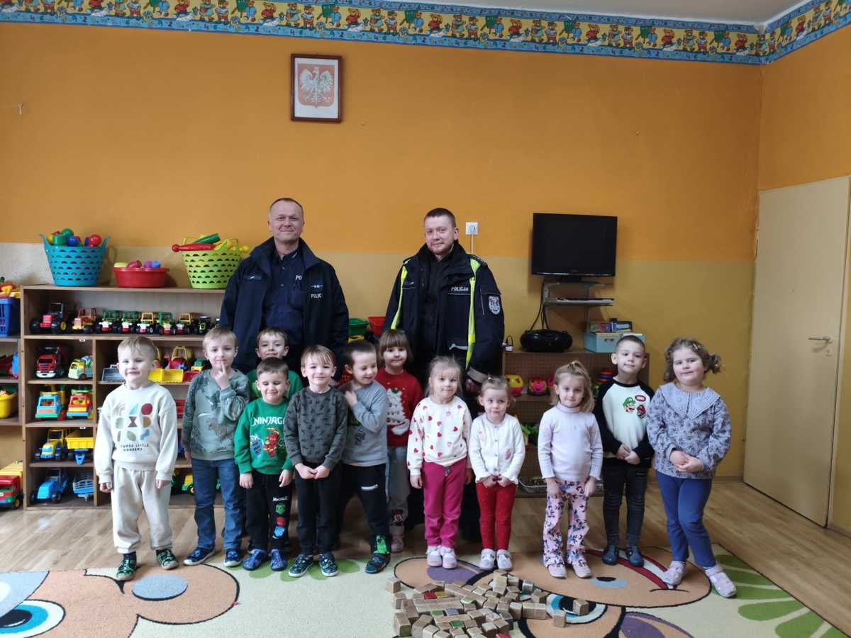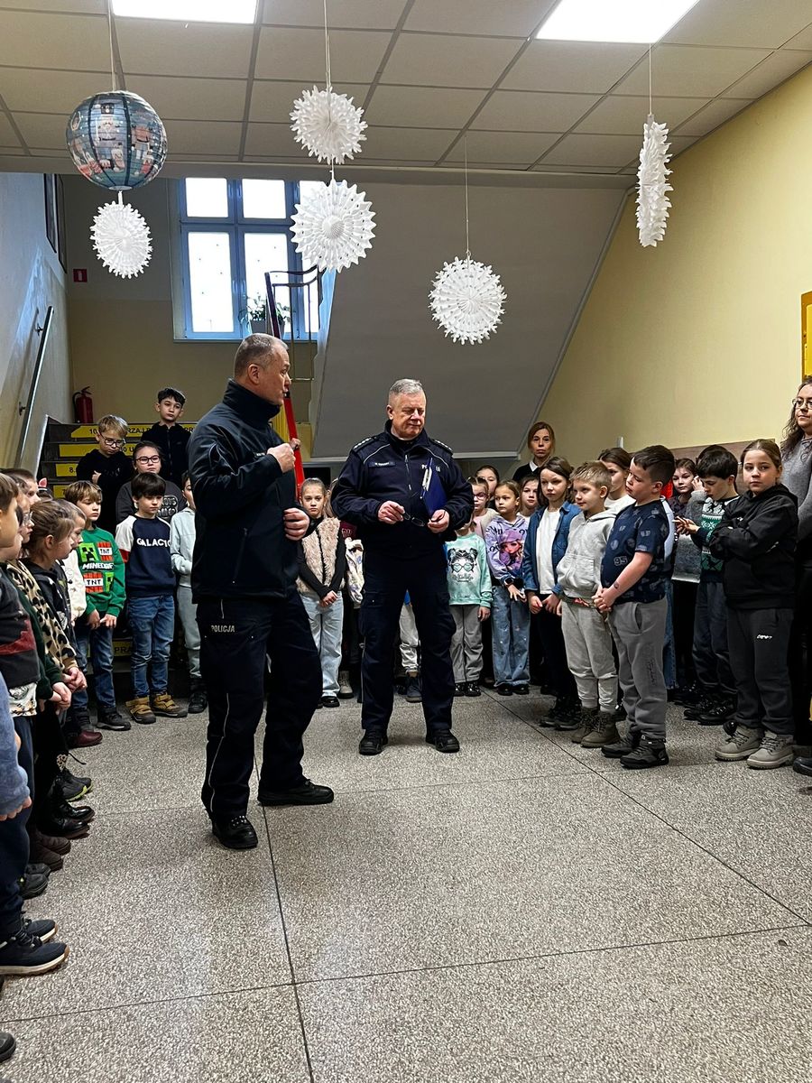 Bezpieczeństwo na drodze i na lodzie Głównym celem wizyt było wypracowanie u najmłodszych właściwych postaw w sytuacjach zagrożenia. Policjanci szczegółowo omówili zasady poruszania się po drogach po zmroku, podkreślając kluczową rolę elementów odblaskowych. Ważnym punktem zajęć była również przestroga przed wchodzeniem na zamarznięte jeziora i stawy. Mundurowi tłumaczyli, dlaczego „bezpieczny lód” nie istnieje i jak należy reagować, gdybyśmy byli świadkami niebezpiecznego zdarzenia.